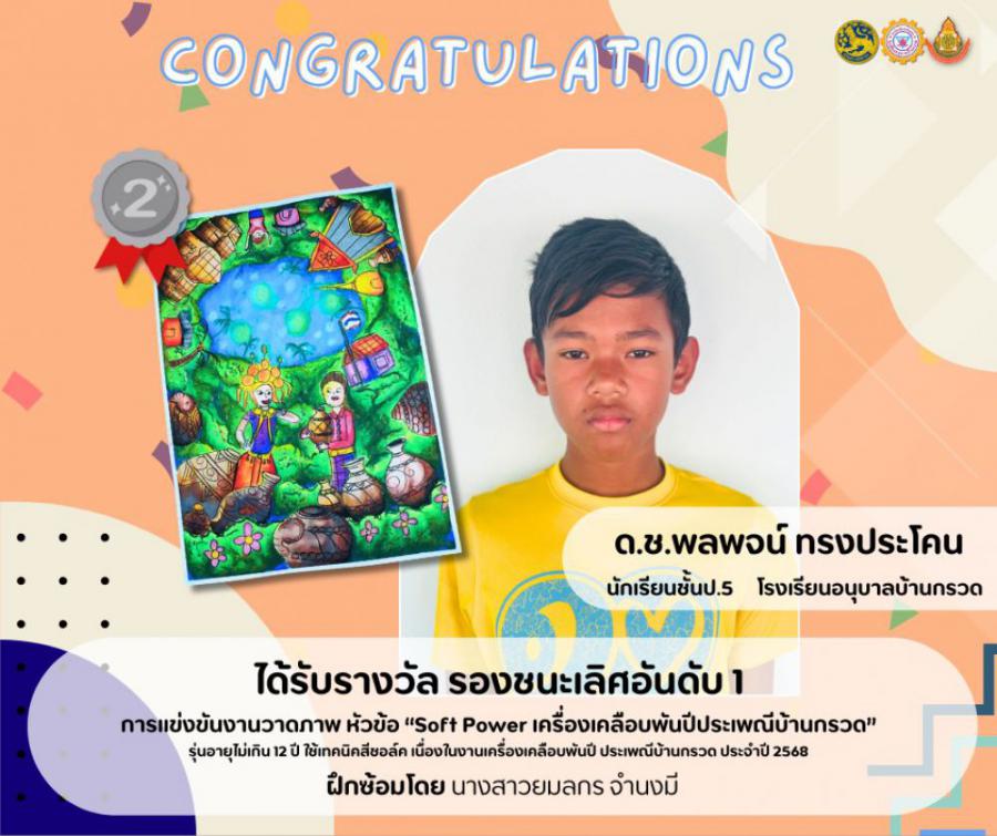 วันที่เสาร์ 8 มีนาคม 2568 โรงเรียนอนุบาลบ้านกรวด ได้นำนักเรียนเข้าร่วมแข่งขันงานวาดภาพ หัวข้อ Soft Power เครื่องเคลือบพันปีประเพณีบ้านกรวด รุ่นอายุไม่เกิน 12 ปี ใช้เทคนิคสีชอล์ค เนื่องในงานเครื่องเคลือบพันปี ประเพณีบ้านกรวด ประจำปี 2568 ระหว่างวันที่ 7-11 มีนาคม พ.ศ.2568 ณ ที่ว่าการอำเภอบ้านกรวด โดยนักเรียนโรงเรียนอนุบาลบ้านกรวดได้รับรางวัล จากการแข่งขัน จำนวน 2 คนดังนี้ 1. ด.ช. ศิวกร โชติยา นักเรียนชั้นประถมศึกษาปีที่ 5 ได้รับรางวัล ชนะเลิศ ฝึกซ้อมโดย นางสาวกานต์ธิดา คำกลอง 2. ด.ช. พลพจน์ ทรงประโคน นักเรียนชั้นประถมศึกษาปีที่ 5 ได้รับรางวัล รองชนะเลิศอันดับ 1 ฝึกซ้อมโดย นางสาวยมลกร จำนงมี อำนวยการฝึกซ้อมโดย ผอ.อภิชาติ หวังสวัสดิ์ปรีชา S:0
