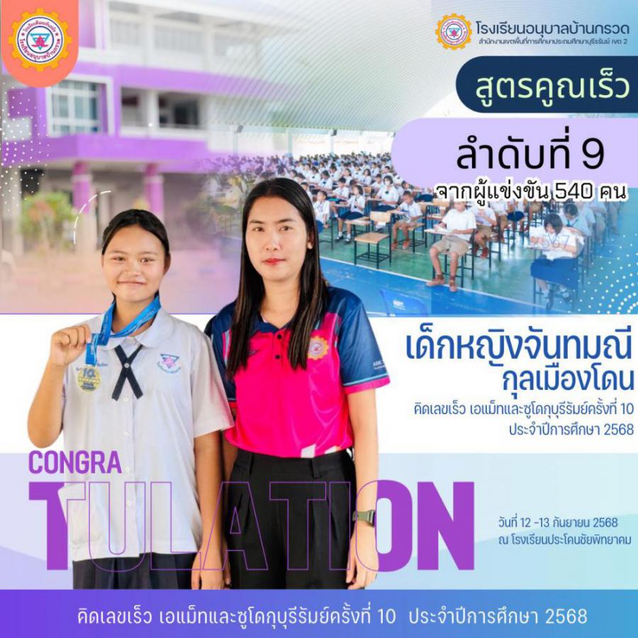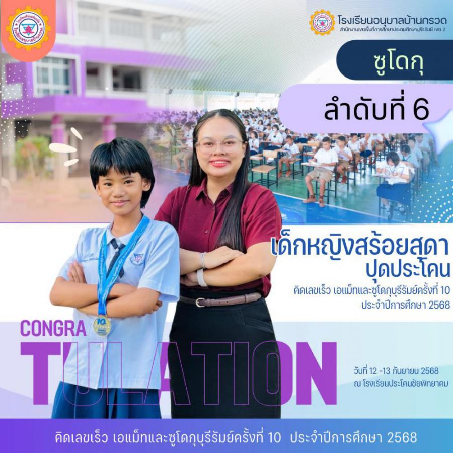 วันที่ 12 -13 กันยายน 2568 โรงเรียนอนุบาลบ้านกรวดนำนักเรียนเข้าร่วมการแข่งขัน สูตรคูณเร็ว ซูโดกุ และเวทคณิต รายการ ? คิดเลขเร็ว เอแม็ทและซูโดกุบุรีรัมย์ครั้งที่ 10 ประจำปีการศึกษา 2568 ? เพื่อพัฒนาทักษะกระบวนการทางคณิตศาสตร์ ด้วยความมุ่งหวังที่จะส่งเสริมให้นักเรียนมีทักษะที่ดีเยี่ยมและสามารถแข่งขันในระดับสูงได้ กิจกรรมนี้ไม่เพียงแต่เป็นโอกาสในการแสดงความสามารถ แต่ยังเป็นการสร้างความสนุกสนานและความท้าทายที่น่าตื่นเต้นสำหรับนักเรียนอีกด้วย นักเรียนที่เข้าร่วมได้รับการเตรียมความพร้อมจากคุณครูผู้ฝึกซ้อม และได้รับการสนับสนุนจากผู้ปกครองอย่างเต็มที่ งานนี้ไม่เพียงแต่จะช่วยพัฒนาความสามารถด้านคณิตศาสตร์ของนักเรียนเท่านั้น แต่ยังเสริมสร้างความมั่นใจและความรักในการเรียนรู้ที่มีค่าอย่างยิ่งในอนาคต S:0