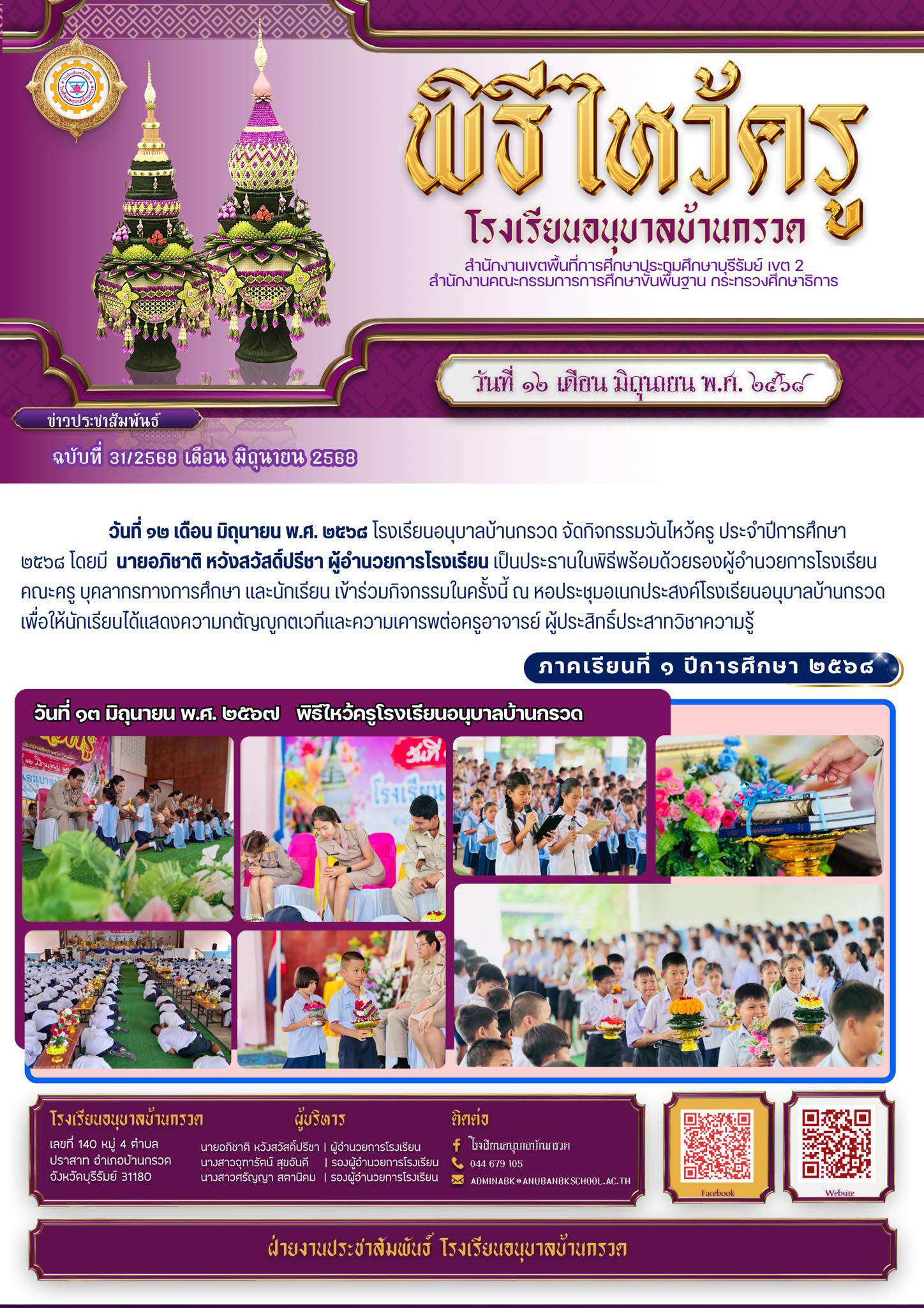 วันที่ 12 เดือน มิถุนายน พ.ศ. 2568 โรงเรียนอนุบาลบ้านกรวด จัดกิจกรรมวันไหว้ครู ประจำปีการศึกษา 2568 โดยมี นายอภิชาติ หวังสวัสดิ์ปรีชา ผู้อำนวยการโรงเรียน เป็นประธานในพิธีพร้อมด้วยรองผู้อำนวยการโรงเรียน คณะครู บุคลากรทางการศึกษา และนักเรียน เข้าร่วมกิจกรรมในครั้งนี้ ณ หอประชุมอเนกประสงค์โรงเรียนอนุบาลบ้านกรวด เพื่อให้นักเรียนได้แสดงความกตัญญูกตเวทีและความเคารพต่อครูอาจารย์ ผู้ประสิทธิ์ประสาทวิชาความรู้