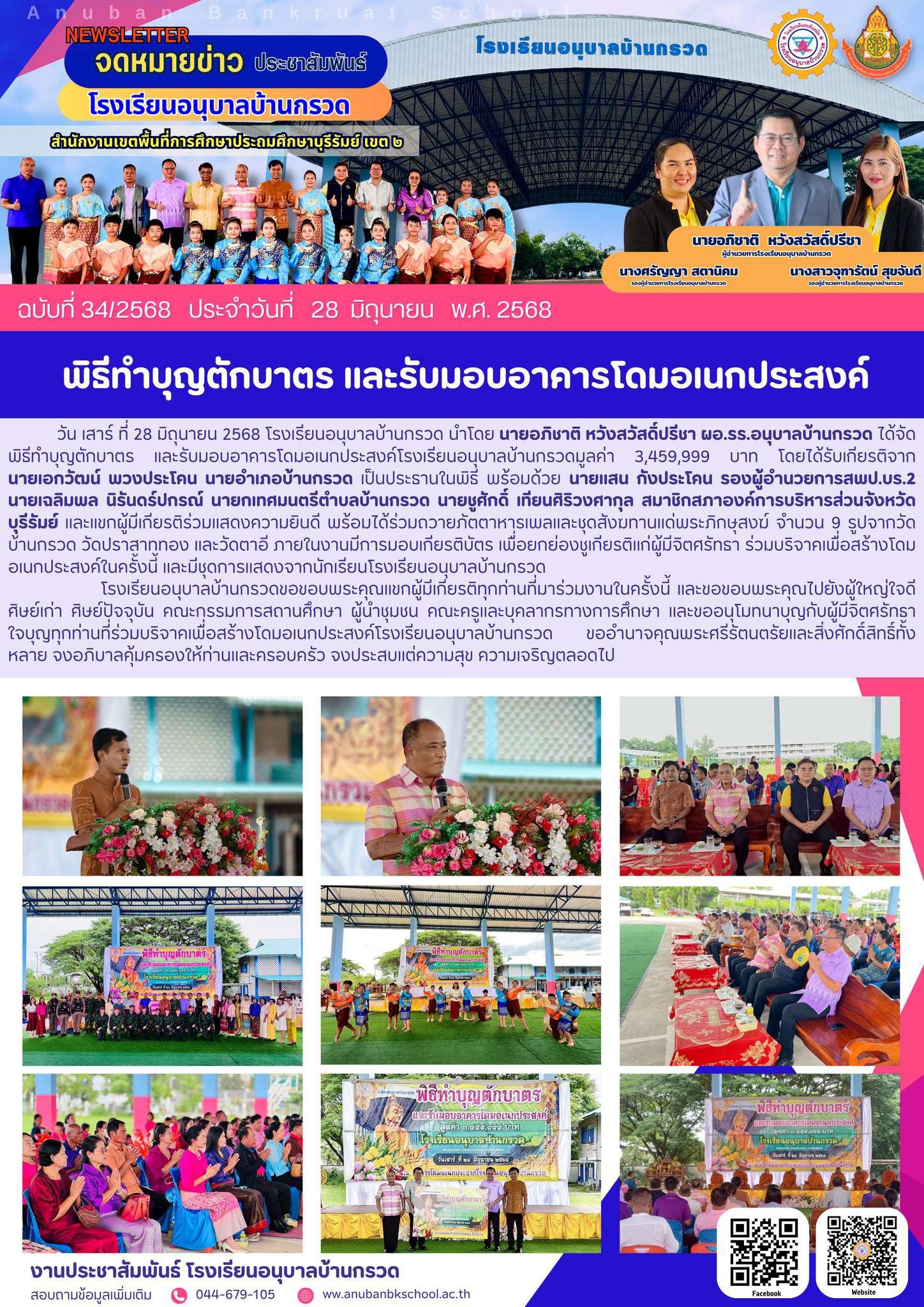 วันที่ 28 มิถุนายน 2567 โรงเรียนอนุบาลบ้านกรวด ได้จัดพิธีทำบุญตักบาตร และรับมอบอาคารโดมอเนกประสงค์โดยได้รับเกียรติจาก นายเอกวัฒน์ พวงประโคน นายอำเภอบ้านกรวด เป็นประธานในพิธี พร้อมด้วย นายแสน กังประโคน รองผู้อำนวยการสพป.บร.2 นายเฉลิมพล นิรันดร์ปกรณ์ นายกเทศมนตรีตำบลบ้านกรวด นายชูศักดิ์ เทียนศิริวงศากุล สมาชิกสภาองค์การบริหารส่วนจังหวัดบุรีรัมย์ และแขกผู้มีเกียรติร่วมแสดงความยินดี พร้อมได้ร่วมถวายภัตตาหารเพลและชุดสังฆทานแด่พระภิกษุสงฆ์ จำนวน 9 รูปจากวัดบ้านกรวด วัดปราสาททอง และวัดตาอี ภายในงานมีการมอบเกียรติบัตร เพื่อยกย่องชูเกียรติแก่ผู้มีจิตศรัทธา ร่วมบริจาคเพื่อสร้างโดมอเนกประสงค์ในครั้งนี้ และมีชุดการแสดงจากนักเรียนโรงเรียนอนุบาลบ้านกรวด