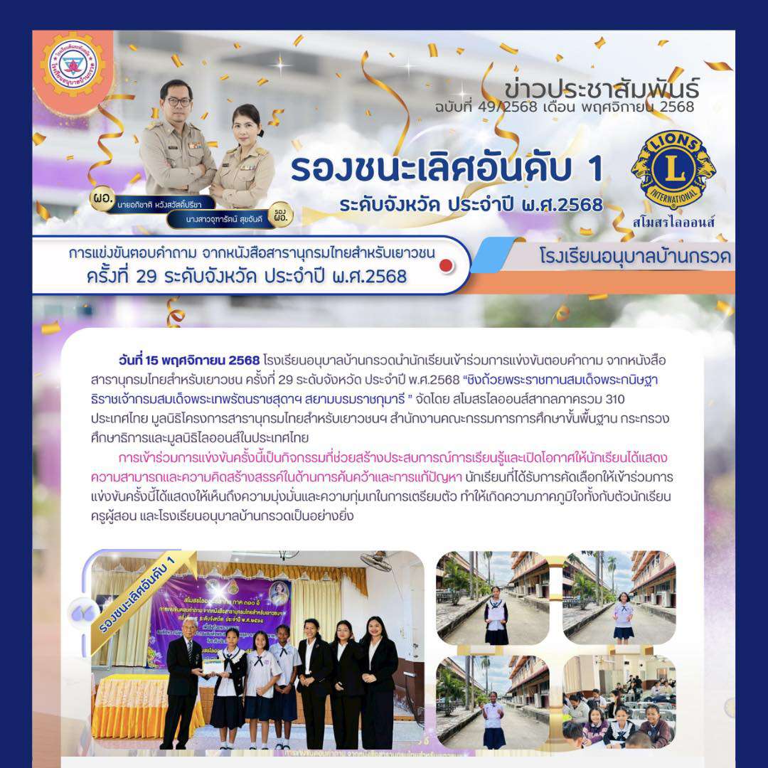 วันที่ 15 พฤศจิกายน 2568 โรงเรียนอนุบาลบ้านกรวดนำนักเรียนเข้าร่วมการแข่งขัน ตอบคำถาม จากหนังสือสารานุกรมไทยสำหรับเยาวชน ครั้งที่ 29 ระดับจังหวัด ประจำปี พ.ศ.2568 “ชิงถ้วยพระราชทานสมเด็จพระกนิษฐาธิราชเจ้ากรมสมเด็จพระเทพรัตนราชสุดาฯ สยามบรมราชกุมารี ” จัดโดย สโมสรไลออนส์สากลภาครวม 310 ประเทศไทย มูลนิธิโครงการสารานุกรมไทยสำหรับเยาวชนฯ สำนักงานคณะกรรมการการศึกษาขั้นพื้นฐาน กระทรวงศึกษาธิการและมูลนิธิไลออนส์ในประเทศไทย