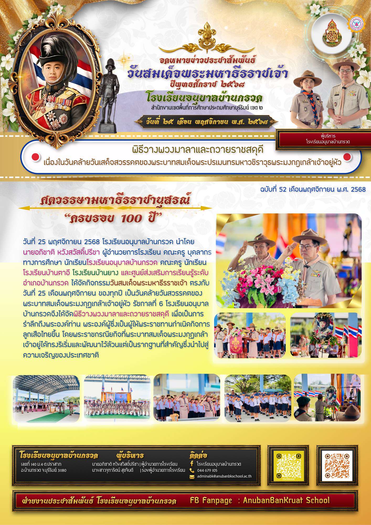 วันที่ 25 พฤศจิกายน 2568 โรงเรียนอนุบาลบ้านกรวด นำโดย นายอภิชาติ หวังสวัสดิ์ปรีชา ผู้อำนวยการโรงเรียน คณะครู บุคลากรทางการศึกษา นักเรียนโรงเรียนอนุบาลบ้านกรวด คณะครู นักเรียนโรงเรียนบ้านตาอี โรงเรียนบ้านยาง และศูนย์ส่งเสริมการเรียนรู้ระดับอำเภอบ้านกรวด ได้จัดกิจกรรมวันสมเด็จพระมหาธีรราชเจ้า ตรงกับวันที่ 25 เดือนพฤศจิกายน ของทุกปี เป็นวันคล้ายวันสวรรคตของพระบาทสมเด็จพระมงกุฏเกล้าเจ้าอยู่หัว รัชกาลที่ 6 โรงเรียนอนุบาลบ้านกรวดจึงได้จัดพิธีวางพวงมาลาและถวายราชสดุดี เพื่อเป็นการรำลึกถึงพระองค์ท่าน พระองค์ผู้ซึ่งเป็นผู้ให้พระราชทานกำเนิดกิจการลูกเสือไทยขึ้น โดยพระราชกรณียกิจที่พระบาทสมเด็จพระมงกุฏเกล้าเจ้าอยู่ได้ทรงริเริ่มและพัฒนาไว้ล้วนแต่เป็นรากฐานที่สำคัญซึ่งนำไปสู่ความเจริญของประเทศชาติ