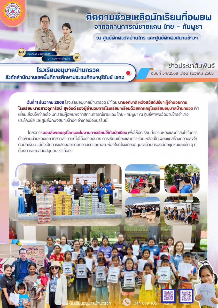 วันที่ 11 ธันวาคม 2568 โรงเรียนอนุบาลบ้านกรวด นำโดย นายอภิชาติ หวังสวัสดิ์ปรีชา ผู้อำนวยการโรงเรียน นางสาวจุฑารัตน์ สุขจันดี รองผู้อำนวยการโรงเรียน พร้อมด้วยคณะครูโรงเรียนอนุบาลบ้านกรวด เข้าเยี่ยมเยือนให้กำลังใจ นักเรียนผู้อพยพจากสถานการณ์ชายแดน ไทย - กัมพูชา ณ ศูนย์พักพิงวัดบ้านไทรอำเภอประโคนชัย และศูนย์พักพิงสนามช้างฯ อำเภอเมืองบุรีรัมย์