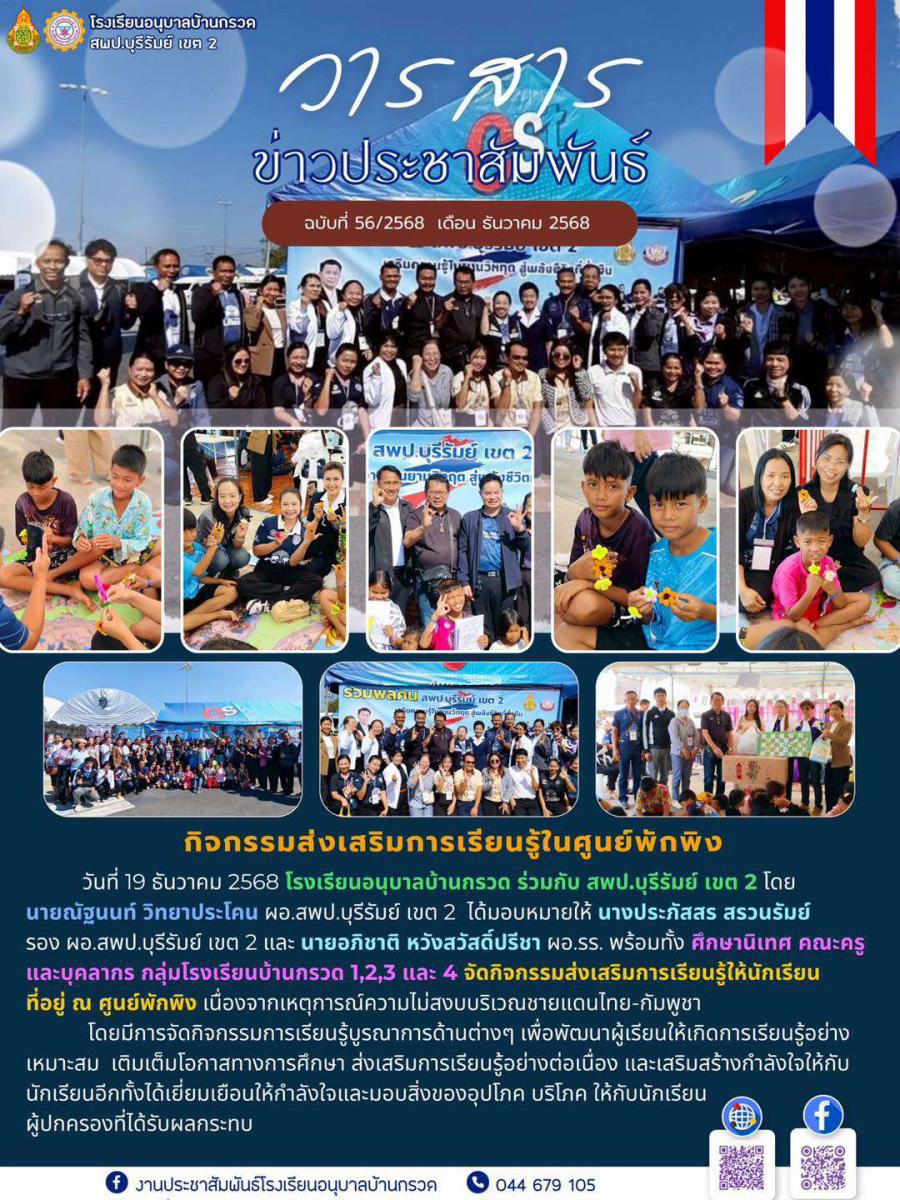 วันที่ 19 ธันวาคม 2568 โรงเรียนอนุบาลบ้านกรวด ร่วมกับ สพป.บุรีรัมย์ เขต 2 โดยนายณัฐนนท์ วิทยาประโคน ผอ.สพป.บุรีรัมย์ เขต 2 ได้มอบหมายให้ นางประภัสสร สรวนรัมย์รอง ผอ.สพป.บุรีรัมย์ เขต 2 และ นายอภิชาติ หวังสวัสดิ์ปรีชา ผอ.รร. พร้อมทั้ง ศึกษานิเทศ คณะครูและบุคลากร กลุ่มโรงเรียนบ้านกรวด 1,2,3 และ 4 จัดกิจกรรมส่งเสริมการเรียนรู้ให้นักเรียน ที่อยู่ ณ ศูนย์พักพิง เนื่องจากเหตุการณ์ความไม่สงบบริเวณชายแดนไทย-กัมพูชา