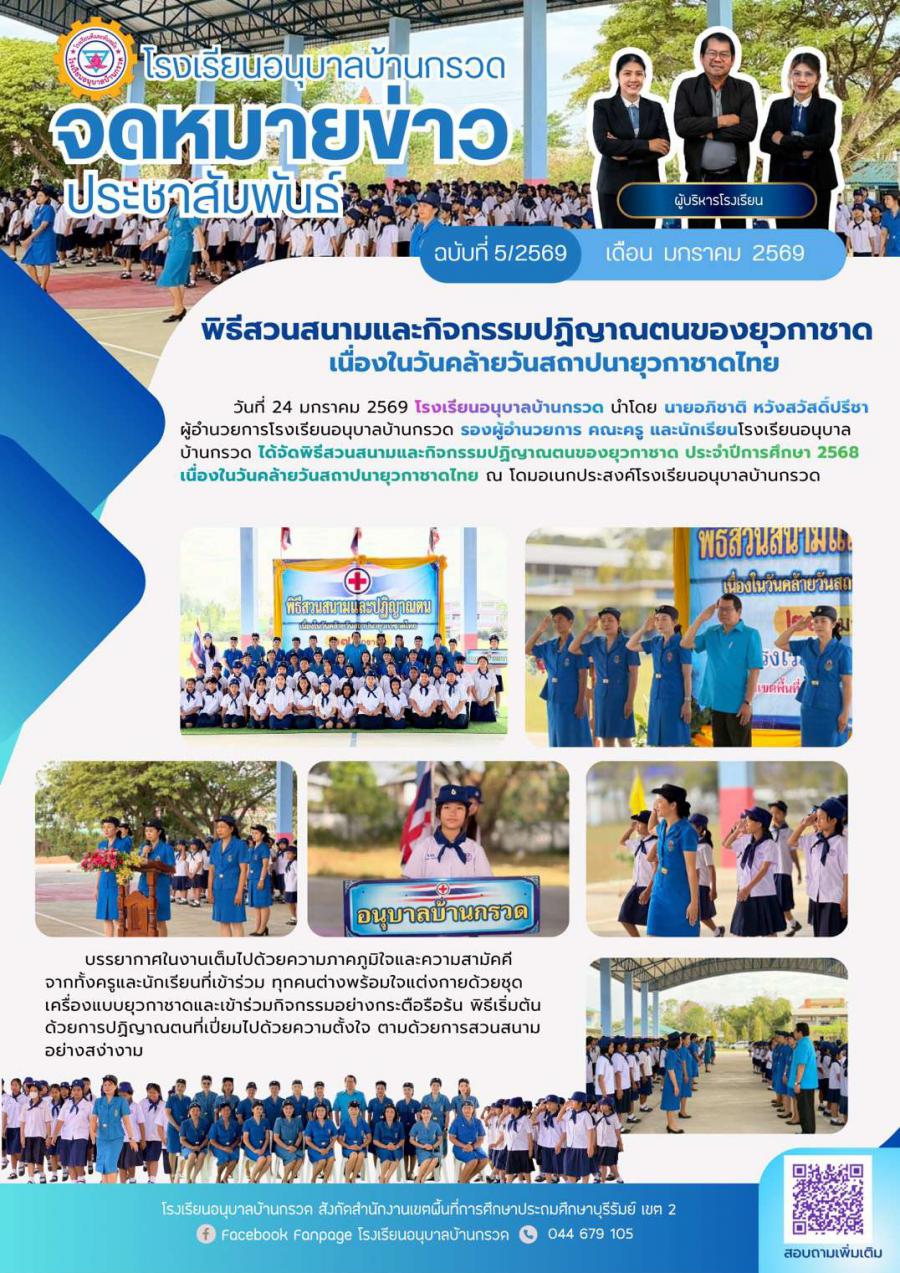 วันที่ 24 มกราคม 2569 โรงเรียนอนุบาลบ้านกรวด นำโดย นายอภิชาติ หวังสวัสดิ์ปรีชา ผู้อำนวยการโรงเรียนอนุบาลบ้านกรวด รองผู้อำนวยการ คณะครู และนักเรียนโรงเรียนอนุบาลบ้านกรวด ได้จัดพิธีสวนสนามและกิจกรรมปฏิญาณตนของยุวกาชาด ประจำปีการศึกษา 2568 เนื่องในวันคล้ายวันสถาปนายุวกาชาดไทย ณ โดมอเนกประสงค์โรงเรียนอนุบาลบ้านกรวด