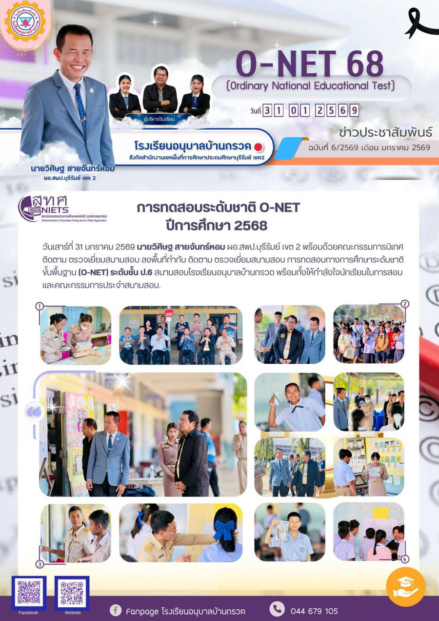 วันเสาร์ที่ 31 มกราคม 2569 นายวิศิษฐ สายจันทร์หอม ผอ.สพป.บุรีรัมย์ เขต 2 พร้อมด้วยคณะกรรมการนิเทศติดตาม ตรวจเยี่ยมสนามสอบ ลงพื้นที่กำกับ ติดตาม ตรวจเยี่ยมสนามสอบ การทดสอบทางการศึกษาระดับชาติขั้นพื้นฐาน (O-NET) ระดับชั้น ป.6 สนามสอบโรงเรียนอนุบาลบ้านกรวด พร้อมทั้งให้กำลังใจนักเรียนในการสอบและคณะกรรมการประจำสนามสอบ.