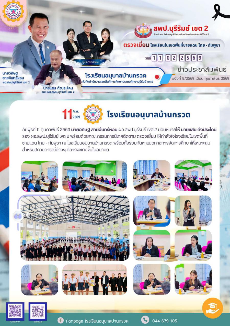 วันพุธที่ 11 กุมภาพันธ์ 2569 นายวิศิษฐ สายจันทร์หอม ผอ.สพป.บุรีรัมย์ เขต 2 มอบหมายให้ นายแสน กังประโคนรอง ผอ.สพป.บุรีรัมย์ เขต 2 พร้อมด้วยคณะกรรมการนิเทศติดตาม ตรวจเยี่ยม ให้กำลังใจโรงเรียนในเขตพื้นที่ชายแดน ไทย - กัมพูชา ณ โรงเรียนอนุบาลบ้านกรวด พร้อมทั้งร่วมกันหาแนวทางการจัดการศึกษาให้เหมาะสมสำหรับสถานการณ์ต่างๆ ที่อาจจะเกิดขึ้นในอนาคต