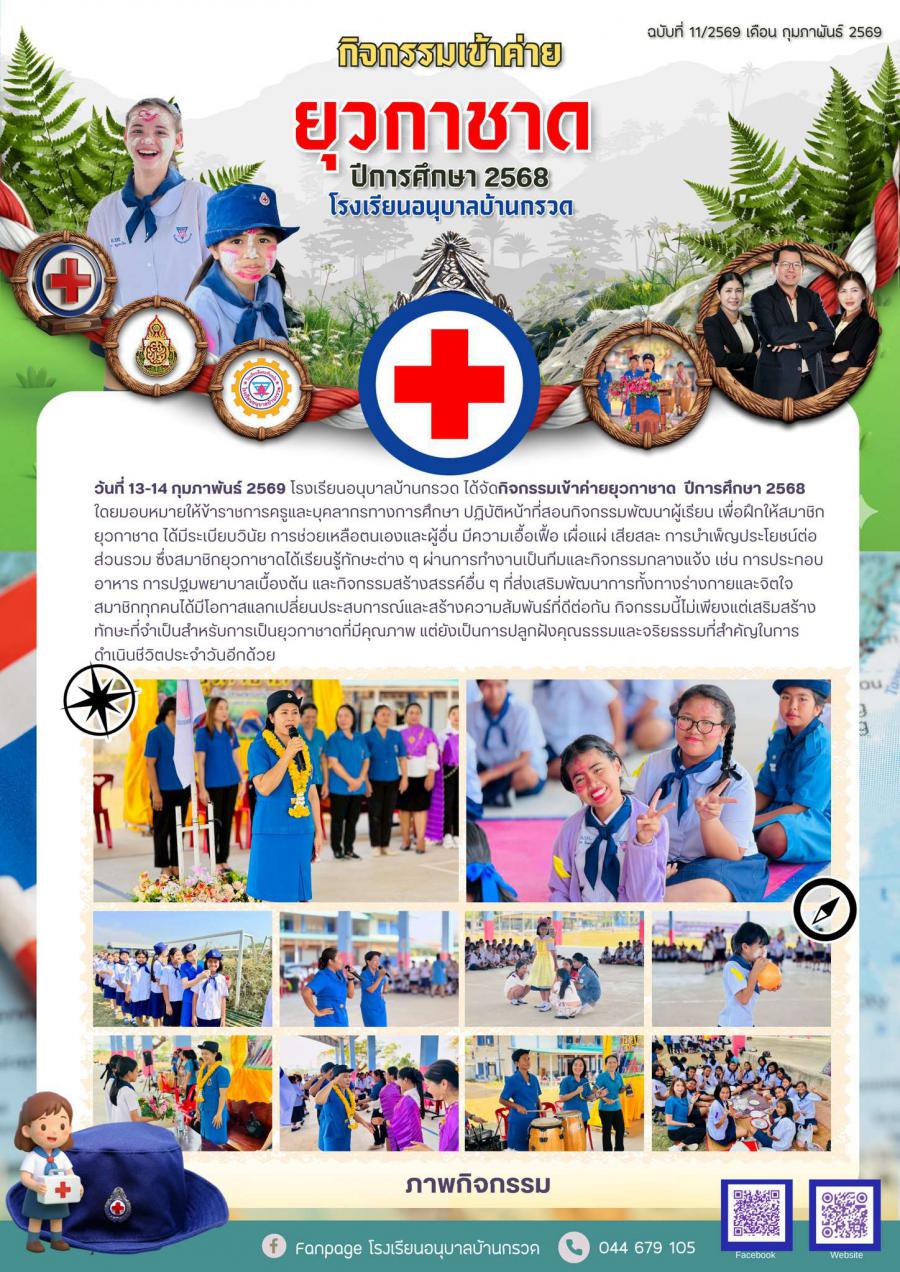 วันที่ 13-14 กุมภาพันธ์ 2569 โรงเรียนอนุบาลบ้านกรวด ได้จัดกิจกรรมเข้าค่ายยุวกาชาด ปีการศึกษา 2568 โดยมอบหมายให้ข้าราชการครูและบุคลากรทางการศึกษา ปฏิบัติหน้าที่สอนกิจกรรมพัฒนาผู้เรียน เพื่อฝึกให้สมาชิกยุวกาชาด ได้มีระเบียบวินัย การช่วยเหลือตนเองและผู้อื่น มีความเอื้อเฟื้อ เผื่อแผ่ เสียสละ การบำเพ็ญประโยชน์ต่อส่วนรวม ซึ่งสมาชิกยุวกาชาดได้เรียนรู้ทักษะต่าง ๆ ผ่านการทำงานเป็นทีมและกิจกรรมกลางแจ้ง เช่น การประกอบอาหาร การปฐมพยาบาลเบื้องต้น และกิจกรรมสร้างสรรค์อื่น ๆ ที่ส่งเสริมพัฒนาการทั้งทางร่างกายและจิตใจ สมาชิกทุกคนได้มีโอกาสแลกเปลี่ยนประสบการณ์และสร้างความสัมพันธ์ที่ดีต่อกัน กิจกรรมนี้ไม่เพียงแต่เสริมสร้างทักษะที่จำเป็นสำหรับการเป็นยุวกาชาดที่มีคุณภาพ แต่ยังเป็นการปลูกฝังคุณธรรมและจริยธรรมที่สำคัญในการดำเนินชีวิตประจำวันอีกด้วย