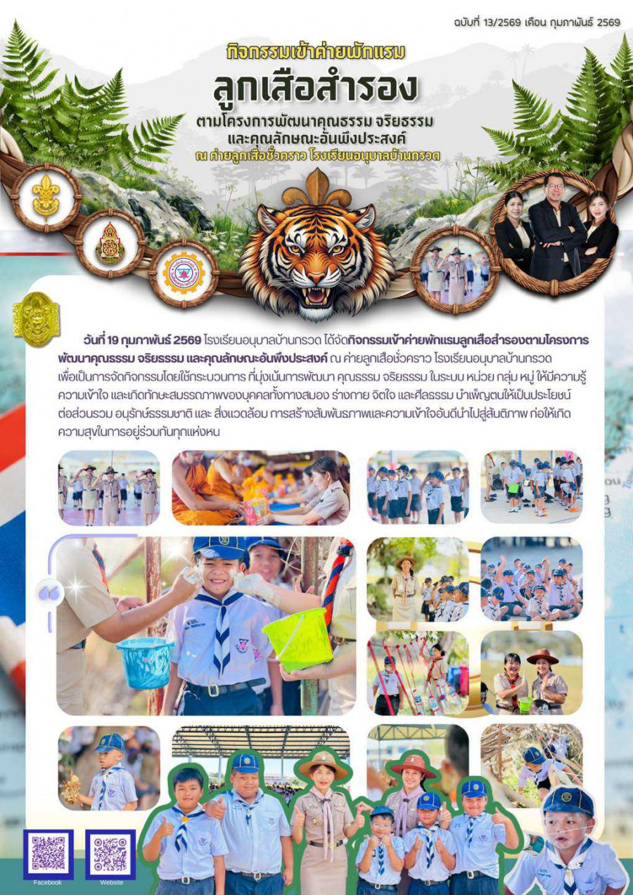 <span style="color:rgb(8, 8, 9); font-family:segoe ui historic,segoe ui,helvetica,arial,sans-serif; font-size:15px">วันที่ 19 กุมภาพันธ์ 2569 โรงเรียนอนุบาลบ้านกรวด ได้จัดกิจกรรมเข้าค่ายพักแรมลูกเสือสำรองตามโครงการพัฒนาคุณธรรม จริยธรรม และคุณลักษณะอันพึงประสงค์ ณ ค่ายลูกเสือชั่วคราว โรงเรียนอนุบาลบ้านกรวด</span>