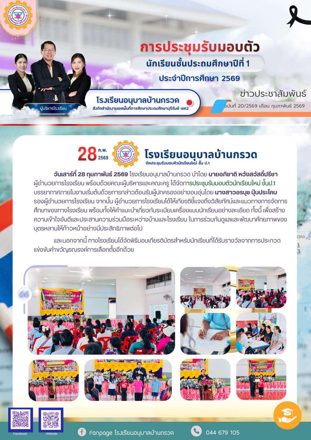 วันเสาร์ที่ 28 กุมภาพันธ์ 2569 โรงเรียนอนุบาลบ้านกรวด นำโดย นายอภิชาติ หวังสวัสดิ์ปรีชา ผู้อำนวยการโรงเรียน พร้อมด้วยคณะผู้บริหารและคณะครู ได้จัดการประชุมรับมอบตัวนักเรียนใหม่ ชั้นป.1 บรรยากาศภายในงานเริ่มต้นด้วยการกล่าวต้อนรับผู้ปกครองอย่างอบอุ่นโดย นางสาวอรนุช ปุ่นประโคน รองผู้อำนวยการโรงเรียน จากนั้น ผู้อำนวยการโรงเรียนได้ให้เกียรติชี้แจงถึงวิสัยทัศน์และแนวทางการจัดการศึกษาของทางโรงเรียน พร้อมทั้งให้คำแนะนำเกี่ยวกับระเบียบเครื่องแบบนักเรียนอย่างละเอียด ทั้งนี้ เพื่อสร้างความเข้าใจอันดีและประสานความร่วมมือระหว่างบ้านและโรงเรียน ในการร่วมกันดูแลและพัฒนาศักยภาพของบุตรหลานให้ก้าวหน้าอย่างมีประสิทธิภาพต่อไป