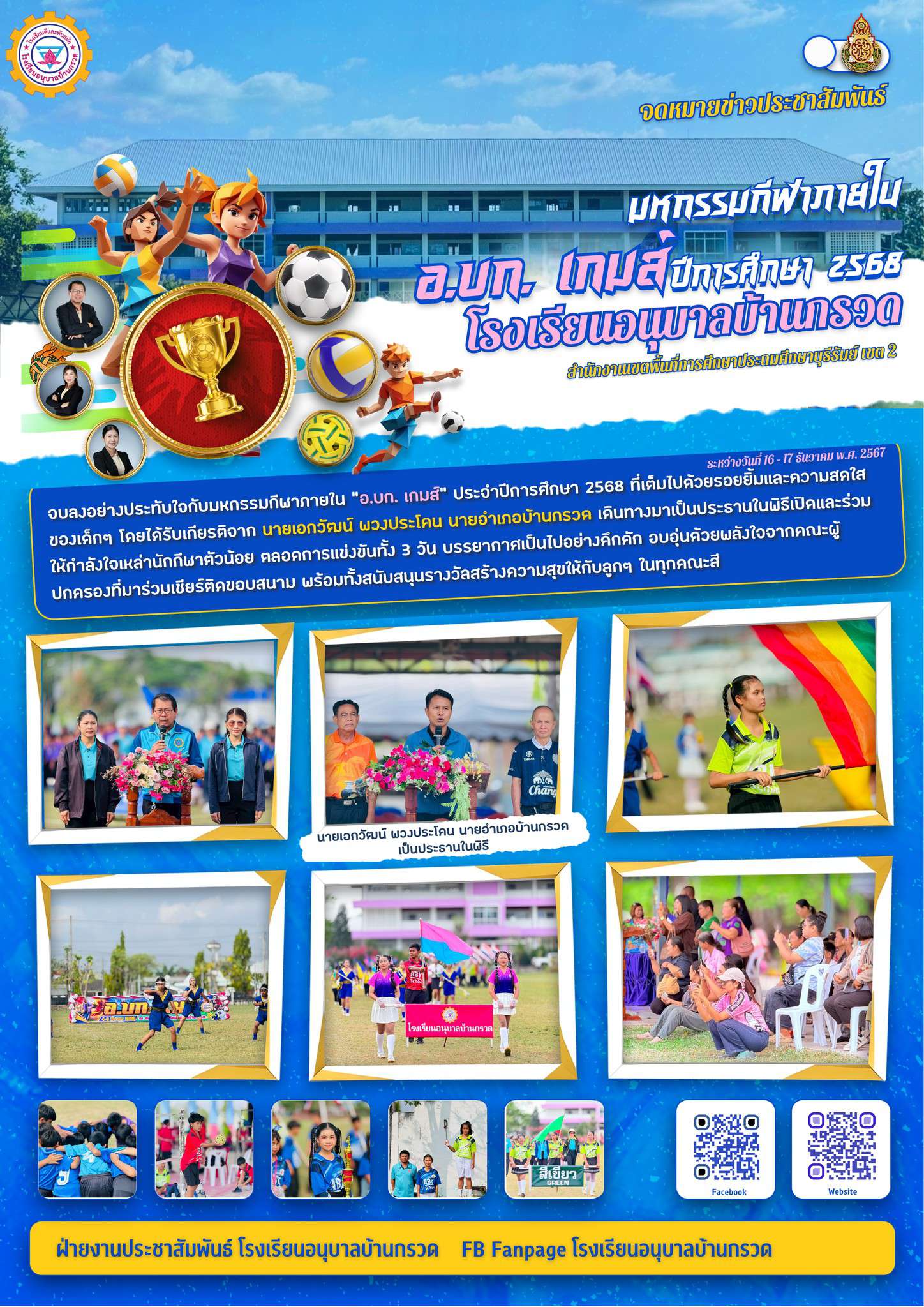 จบลงอย่างประทับใจกับมหกรรมกีฬาภายใน "อ.บก. เกมส์" ประจำปีการศึกษา 2568 ที่เต็มไปด้วยรอยยิ้มและความสดใสของเด็กๆ โดยได้รับเกียรติจาก นายเอกวัฒน์ พวงประโคน นายอำเภอบ้านกรวด เดินทางมาเป็นประธานในพิธีเปิดและร่วมให้กำลังใจเหล่านักกีฬาตัวน้อย ตลอดการแข่งขันทั้ง 3 วัน บรรยากาศเป็นไปอย่างคึกคัก อบอุ่นด้วยพลังใจจากคณะผู้ปกครองที่มาร่วมเชียร์ติดขอบสนาม พร้อมทั้งสนับสนุนรางวัลสร้างความสุขให้กับลูกๆ ในทุกคณะสี สำหรับพิธีปิดงาน นายอภิชาติ หวังสวัสดิ์ปรีชา ผู้อำนวยการโรงเรียน ได้มอบหมายให้ นางสาวจุฑารัตน์ สุขจันดี และนางสาวอรนุช ปุ่นประโคน รองผู้อำนวยการโรงเรียน ให้เกียรติเป็นประธานมอบเหรียญรางวัลและกล่าวปิดการแข่งขัน ทิ้งท้ายไว้ด้วยภาพความสามัคคีและมิตรภาพที่งดงามของครอบครัวอนุบาลบ้านกรวดทุกคน